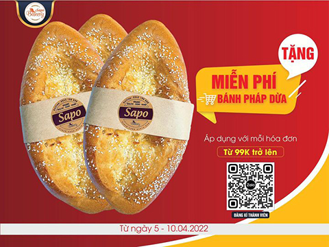 Với mỗi hoá đơn từ 99K trở lên, khách hàng đăng kí thành viên "Khách hàng thân thiết" qua ứng dụng Zalo bằng cách quét mã QR tại quầy thu ngân khi thanh toán sẽ nhận ngay phần quà là 01 chiếc bánh Pháp dừa.